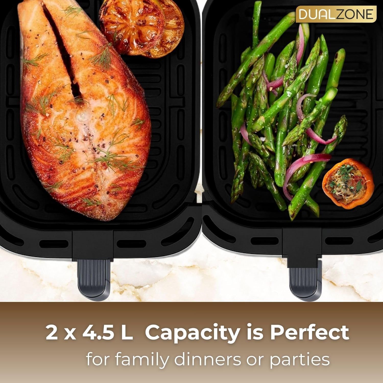 ✅ COOK TWO MEALS AT ONCE – 9L Dual Zone Baskets (4.5L each) Air fry chicken in one basket and cook fries in the other — same time, different temps, no flavour mixing. Perfect for families, guests, or weekly meal prep. Use separate functions, times, and temperatures in each drawer to prepare full meals or suit different preferences.