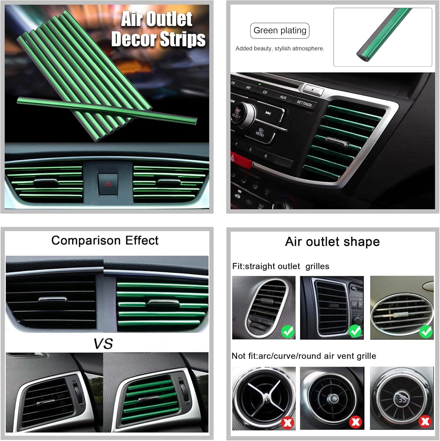 Note: the air outlet decoration strip fit for all straight air vent outlet grille car models,not fit for Arc/curve/round air vent grille .please make sure your air vent outlet grille is straight before order