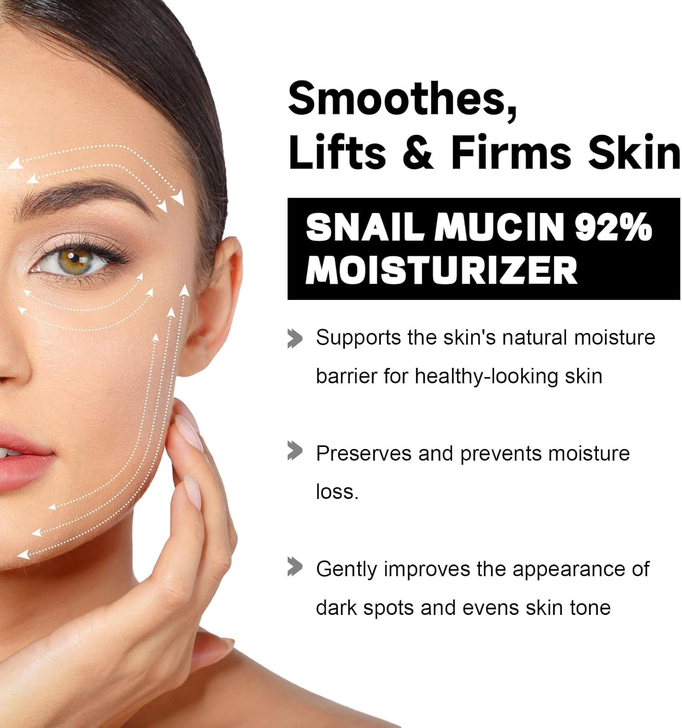 【Ultimate Repair with Snail Mucin】Our snail mucin cream, enriched with 92% snail secretion filtrate, is the ultimate solution for skin repair and rejuvenation. It deeply hydrates and boosts skin vitality, reducing dullness and dryness while soothing dehydrated skin. The result is a visibly healthier, plumper, and more radiant complexion that feels smoother with every use.