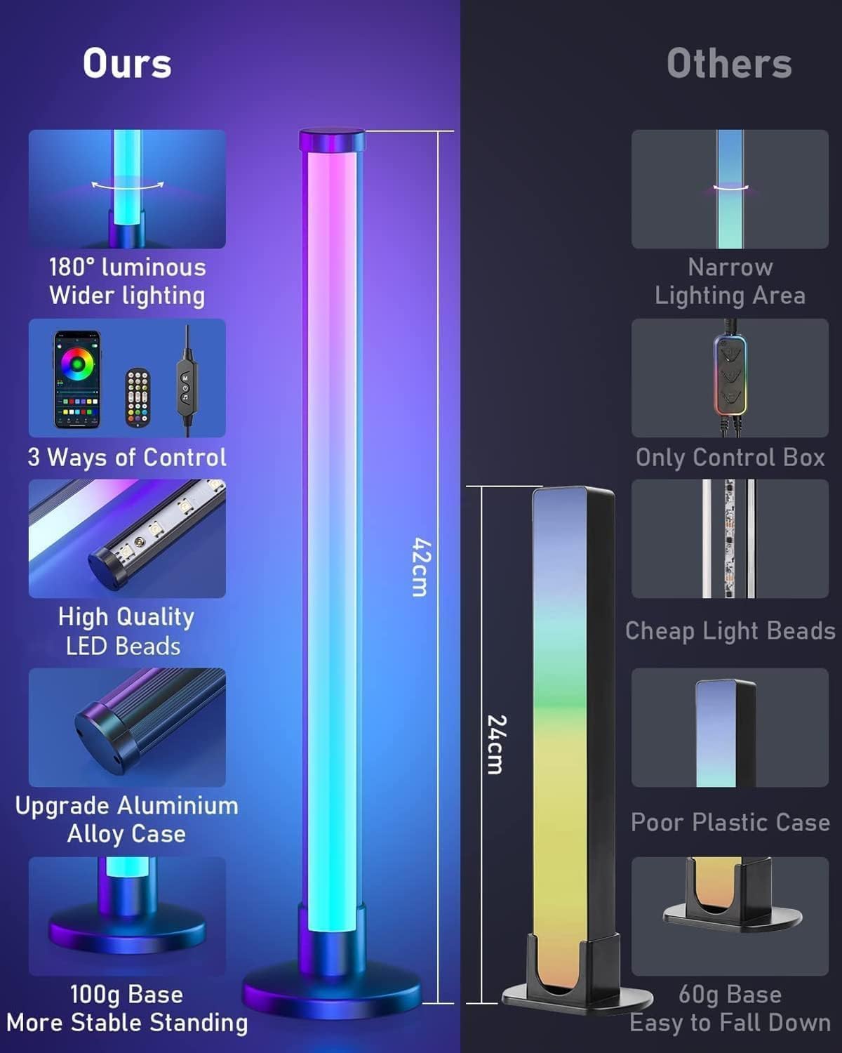 【What You Will Get】Packing List: 2*Smart RGB Light Bar, 1*Remote Control, 1*Control Box, 2*Light Bar Stands, 1*User Manual. You can trust in our quality, We provide professional customer service If there is any quality issue with the light bars.