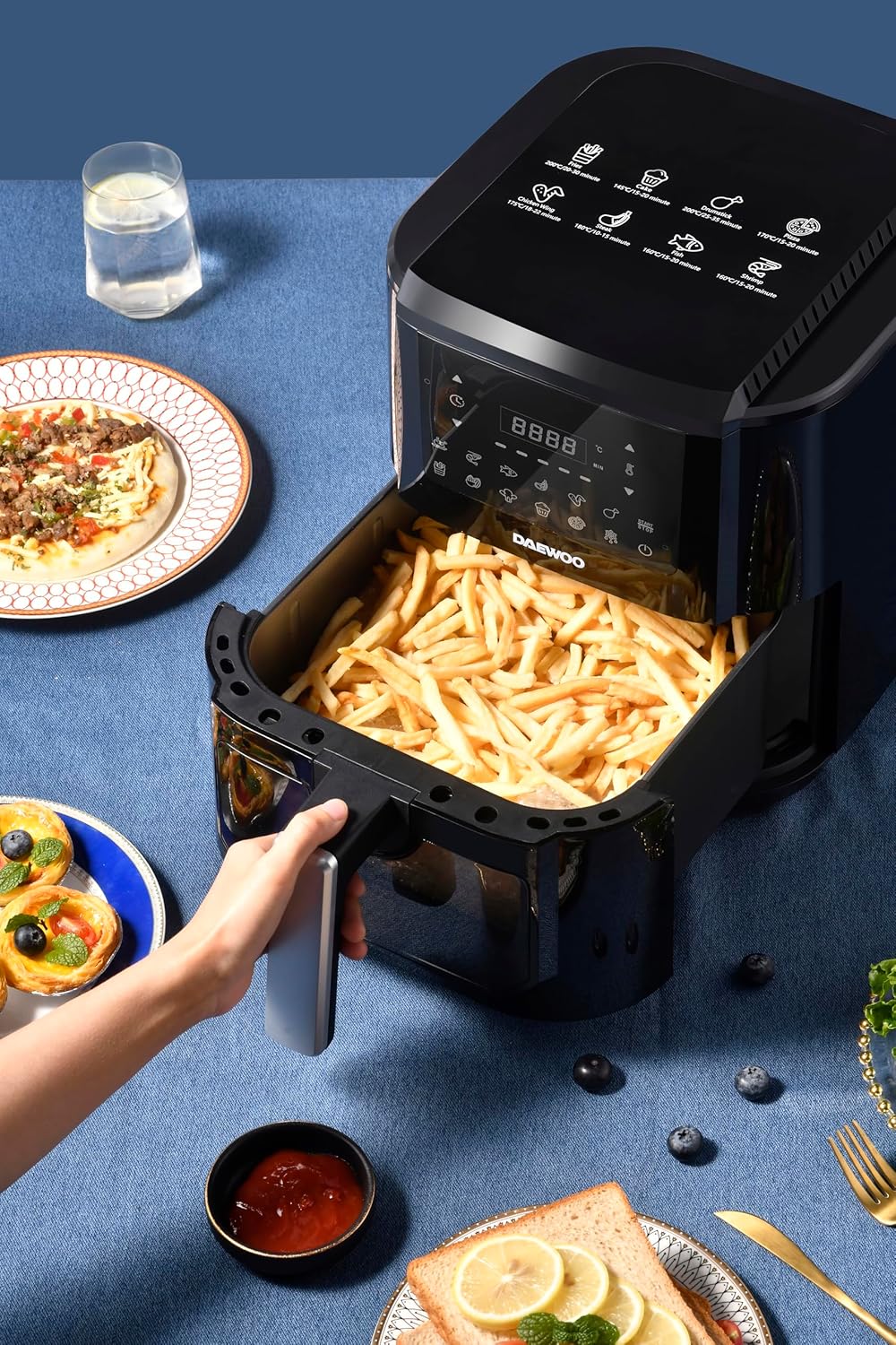 Quick Clean-up: Daewoo’s air fryer features a non-stick coating and scratch-resistant materials, and both the frying basket and removable frying pan are easy to clean and can be quickly and conveniently washed down or put into a dishwasher.