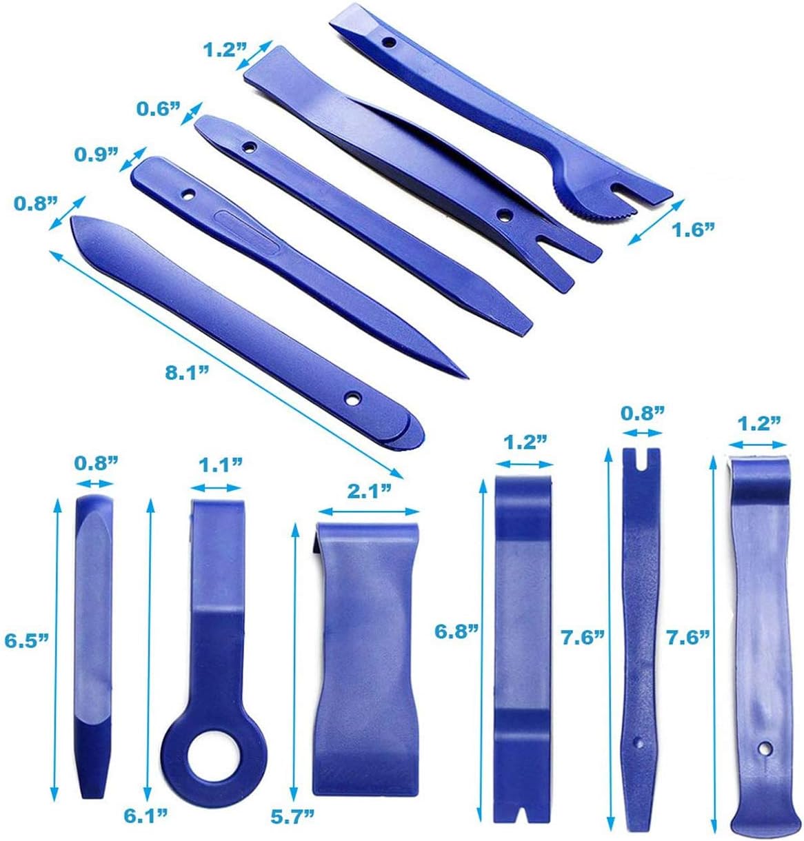 🔧【12-Pack】Trim removal tool kit is excellent for automotive trim removal including stereo systems, fasteners, window, door panel, dashboard etc. It includes 12 trim tools in different types. It also can be used to remove bicycle tire. This multipurpose and easy-to-use kit is a good choice not only for the professionals, but also amateurs.