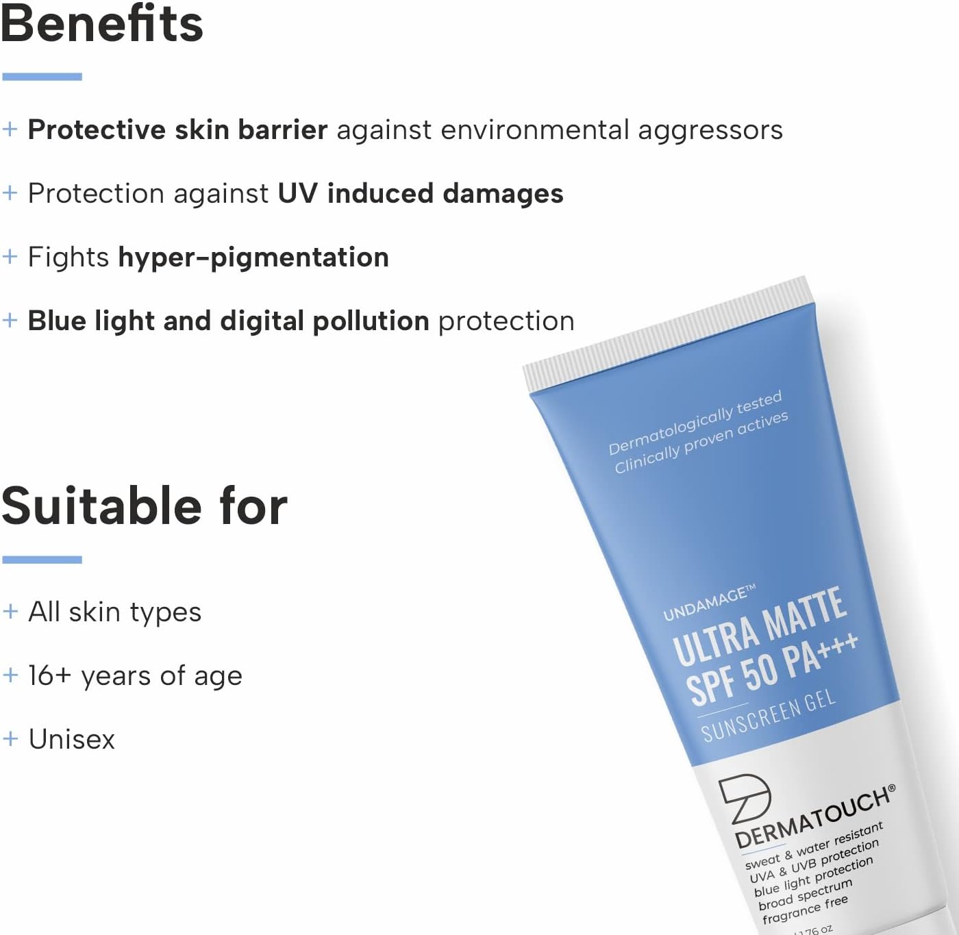 DERMATOUCH Undamage Ultra Matte Sunscreen Gel SPF 50 PA+++ | Water & Sweat Resistant | Fragrance Free | For Broad Spectrum-50G