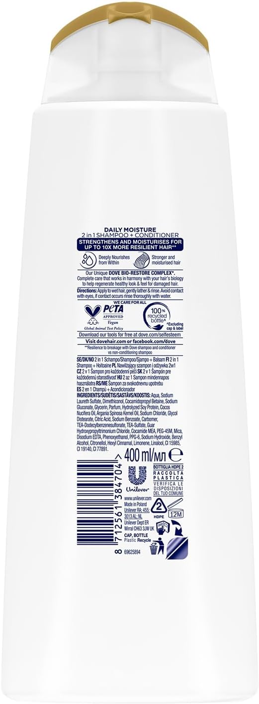 Dove Nutritive Solutions Daily Moisture 2 in 1 Shampoo and Conditioner makes your hair softer, silky smooth and easy to manage. It has been created to nourish and moisturise dry, damaged hair in one simple step. This shampoo and conditioner has a unique formula that helps to enhance and maintain your hair’s beauty. As it progressively nourishes with regular use, you will notice that your hair feels healthier after each and every wash. Dove Daily Moisture 2 in 1 Shampoo and Conditioner contains Pro-Moisture Complex, which moisturises hair from deep within the strand and makes hair up to 10x more resilient*. Its formula is lightweight and rinses out easily, so it won’t leave your hair feeling heavy or weighed down. You just get to enjoy silky-soft results, day after day. How to use: Apply Dove Daily Moisture 2 in 1 Shampoo and Conditioner like you would a normal shampoo, lather, and rinse. No need for an additional conditioner to protect and detangle your hair. Simply dry and enjoy softer hair that is easy to manage and style. Suitable for everyday use. Globally, Dove does not test on animals. For the last 30 years, Dove has used alternative non-animal methods to test the safety of its products. PETA certified as Cruelty-Free, Dove products carry PETA’s Beauty Without Bunnies logo for added peace of mind. *Shampoo and conditioner vs non-conditioning shampoo