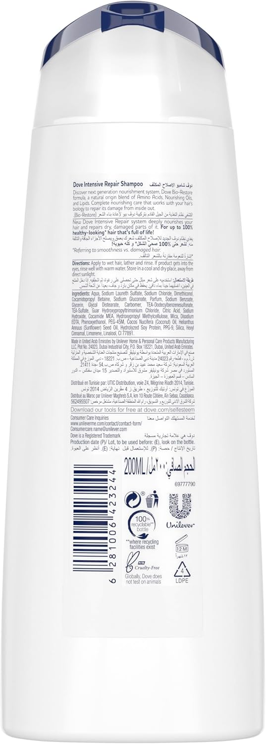 Looking for a shampoo for damaged hair? From styling to changes in the weather, our hair goes through a lot every single day leaving it feeling dry and damaged. However, with the right care you can have nourished, healthy-looking hair, inside and out. Discover Dove’s next generation nourishment hair care system, Dove Bio-Restore formula. It is a natural origin blend of Amino Acids, Nourishing Oils, and Lipids that works with your hair’s biology to repair its damage from inside out, for complete, nourishing care. It gives you up to 100% healthy-looking* hair that’s full of life. New Dove Intensive Repair hair care range deeply nourishes your hair and repairs dry, damaged parts of it. This helps keeping hair detangled and well managed. Directions: Apply to wet hair, lather, massage and rinse. If product gets into the eyes, rinse well with warm water. Store in a cool and dry place, away from direct sunlight. For best results, after shampoo, use Dove Intensive Repair Conditioner and style with Dove Intensive Repair Oil Replacement Cream. Dove helps young people build self-esteem