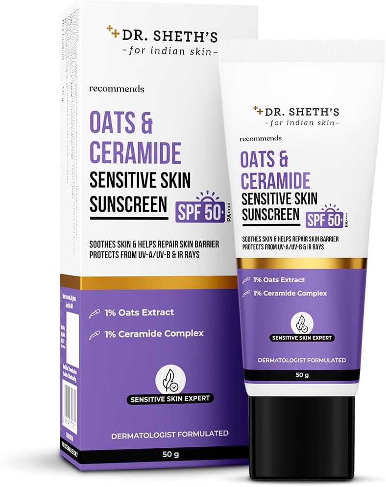 Your sensitive skin isn’t being fussy. It just knows what works (and what doesn’t). Harsh formulas? NO. Heavy sunscreens? Not a chance. But the right mix of protection and care? Now we’re talking. Meet Dr. Sheth’s Oats & Ceramide Sensitive Skin Sunscreen, with the power of nature and science that gives your skin advanced sun protection with soothing care and strength. This Sunscreen offers SPF 50+ PA++++ which is exclusively formulated for delicate, gentle skin. It shields your skin from the sun’s harshest rays without clogging, suffocating, or stinging. The infusion of Oats soothes compromised skin instantly, reducing redness like a deep breath after a long day. Ceramide restores the broken skin barrier, strengthening it with every use. Allantoin heals the skin from the inside out, while Bisabolol calms the sensitivity before it even starts. What’s even better? Its oil-free and weightless formula absorbs so seamlessly that you’ll forget you’re wearing sunscreen at all. Finally, a sunscreen that works for your sensitive skin so you can step into the sun your way.