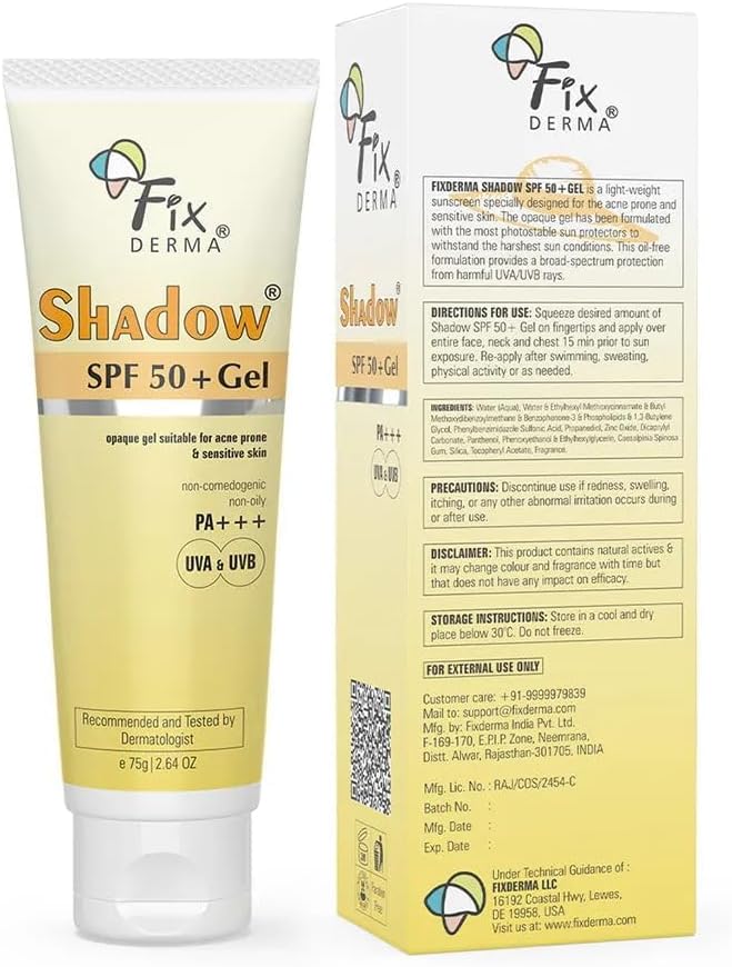 Fixderma Shadow SPF 50 Gel is a lightweight sunscreen specially designed for acne-prone and sensitive skin. The opaque gel has been formulated with the most photostable sun protectors which are ideal for all weathers and suit all skin types. This oil-free formulation provides excellent UV rays coverage for a longer duration of time. Sunscreen is the least preferred skincare formulation in acne conditions because it is thought to make the skin oilier and can worsen acne. But Shadow SPF 50 Gel is a lightweight, oil-free formulation that provides broad-spectrum protection from harmful UVA/UVB rays. Shadow SPF 50 Gel is a well-designed formulation to give high sun protection with a perfect skin feel. It is infused with the power of both physical blockers and chemical absorbers to give a long-lasting effect. Every skin type requires sun protection. Sensitive skin is more prone to sun damage, which makes sunscreen an essential need for such skin types. But most of the time using sunscreen is avoided because a bad formulation can worsen the condition. Fixderma has scientifically designed a gel-based sunscreen especially for the care of acne-prone and sensitive skin. Shadow SPF 50 Gel sunscreen is infused with the power of both physical blockers and chemical absorbers offer safe and long-lasting protection from the UVA & UVB rays. The formulation is completely non-comedogenic and non-greasy which does not block the skin pores and makes it an excellent option for acne-prone skin. It has a highly photostable sunscreen agent, antioxidant, anti-aging, and protective agent. The combination of Ethylhexyl methoxycinnamate, benzophenone-3, and butyl methoxydibenzoylmethane provides perfect full-spectrum protection. The ingredients being in the dispersion phase makes the formulation safe and long performing & ingredient that is water-soluble, highly effective UVB absorber which forms water-soluble salts with the addition of a base. Practically odorless, excellent st.
