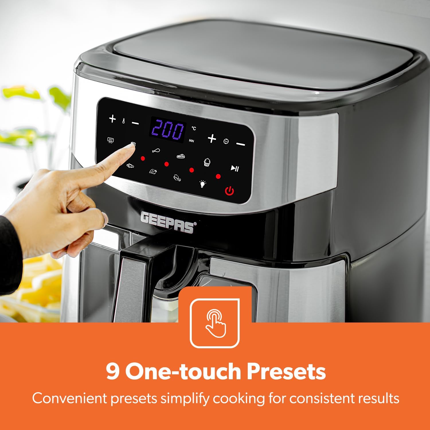 Equipped with a digital LED display with touch screen, 9 preset cooking programs, and a 60-minute timer.