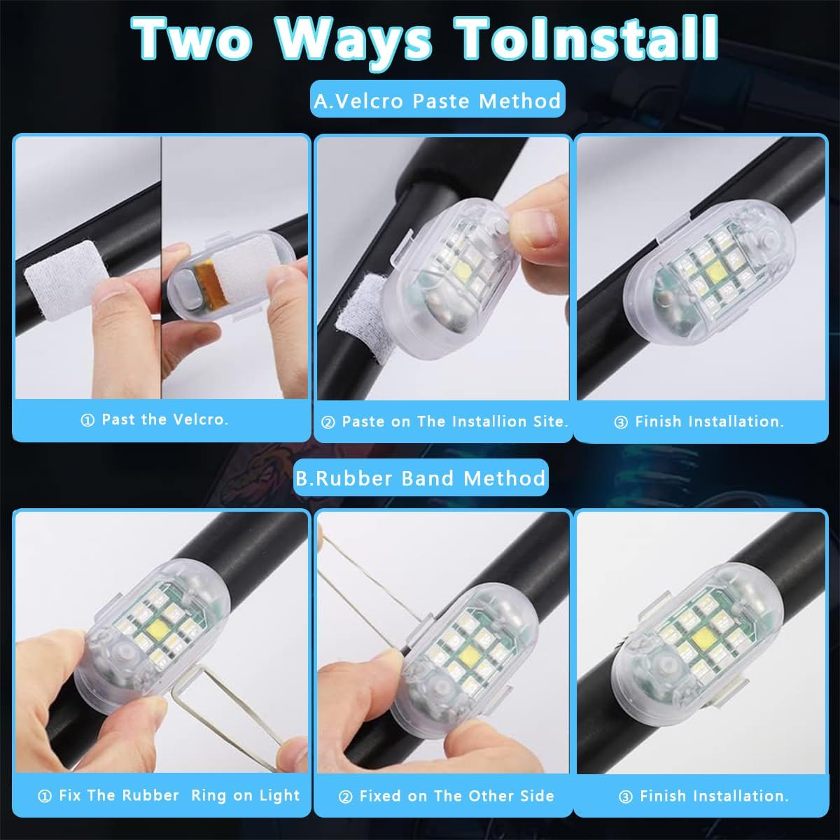 【Easy to Use and Ensure Your Driving Safety】A variety of installation methods, rubber band binding, and paste. Led Strobe Light Protector is made of high-brightness multi-color wicks to enhance the safety of driving and are not afraid of rear-end collisions. The LED Aircraft Strobe Lights increase the night-time and inclement weather visibility. This Aircraft Night Warning Lights can enhance your safety when you are riding in the dark. Safety is our primary consideration.