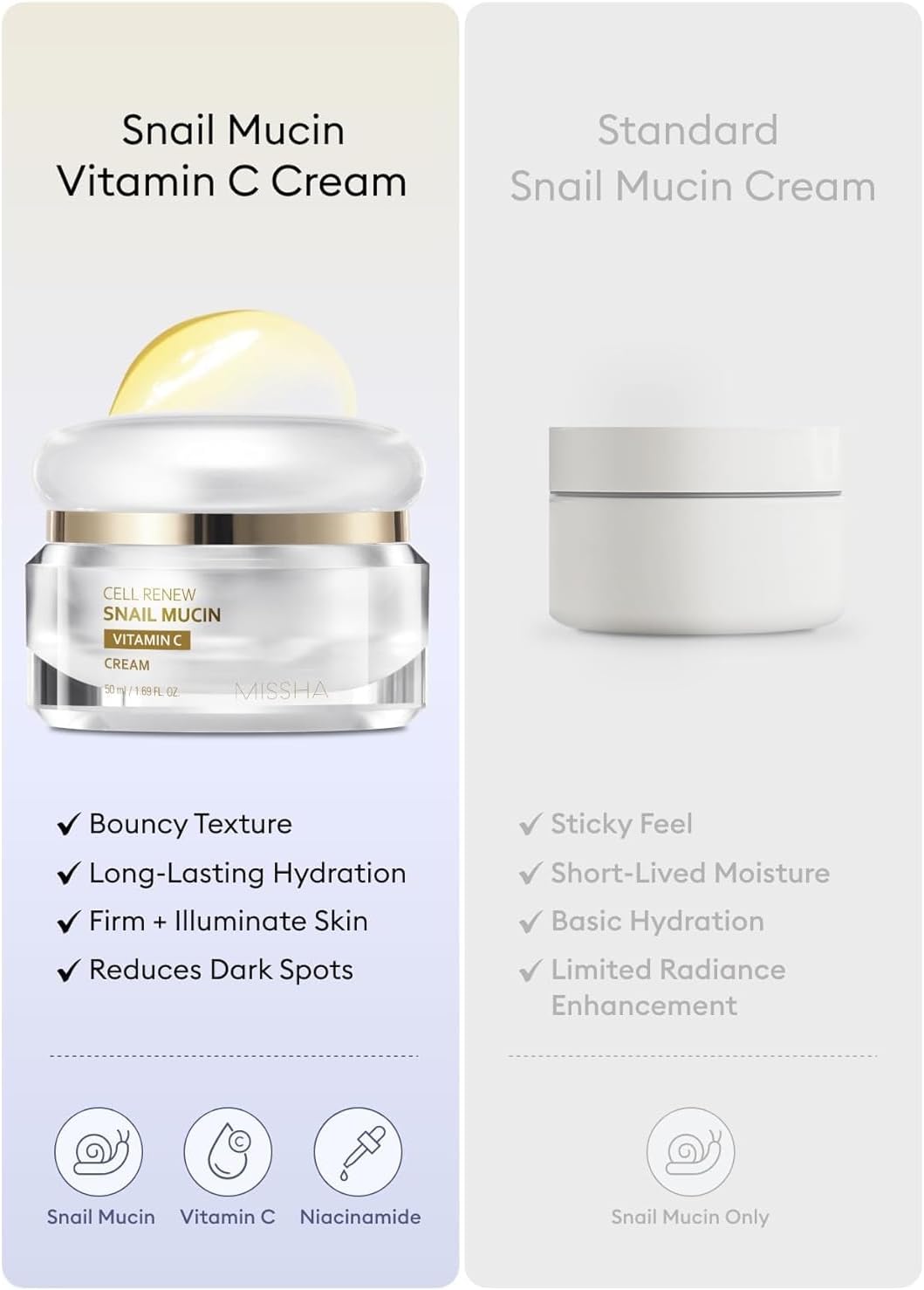 MISSHA Cell Renew Snail Mucin Vitamin C Cream 1.69 Fl oz, Hydrating Snail Mucin, Korean Skin Care for Improved Skin Texture & Youthful Glow, Glass Skin, Korean Moisturizer, Kbeauty, Paraben Free