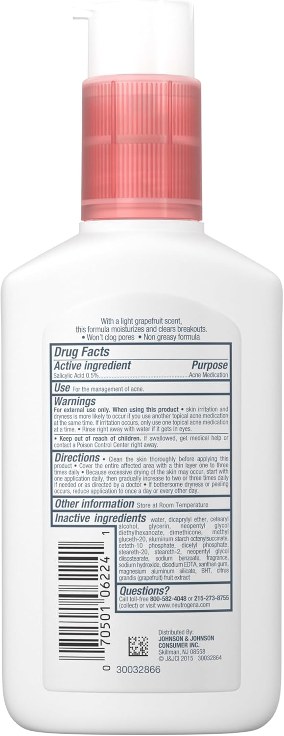 Product Description Moisturize skin and treat breakouts in one step with Neutrogena Oil-Free Acne Pink Grapefruit Facial Moisturizer with salicylic acid. This lightweight lotion formula absorbs quickly to moisturize face without a greasy feel and it’