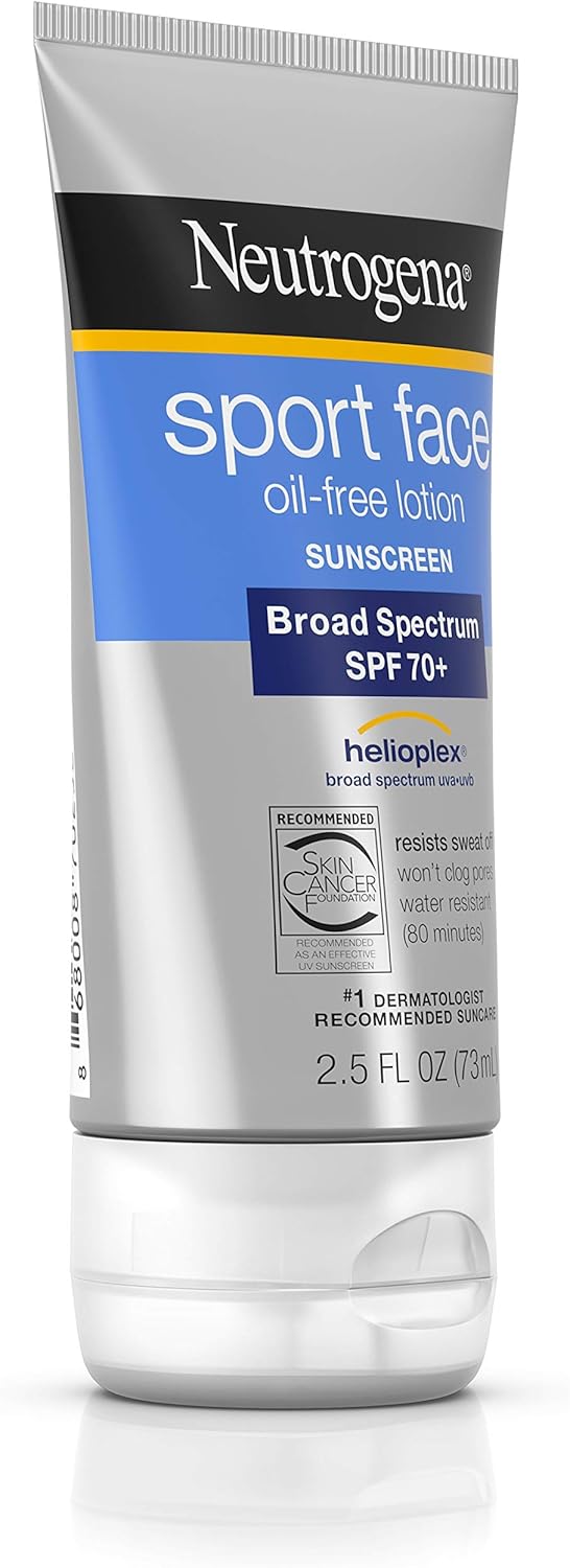 Size:Pack of 1 Play and sweat hard under the sun with Neutrogena Sport Face Lotion Sunscreen Broad Spectrum SPF 70. Ideal for vigorous activity, this facial sunscreen resists wear off from water, rubbing, sweating, or wiping. This sport sunscreen has been formulated with unique Helioplex, a sunscreen technology with superior broad-spectrum protection from skin-aging UVA rays and skin-burning UVB rays. This face sunscreen is both waterproof and sweatproof, and features an electrolyte complex to help nourish and restore skin balance. When used as directed with other sun protection measures, this active sunscreen can help decrease the risk of skin cancer and early skin aging caused by the sun. Neutrogena Sport Face Lotion is PABA-free and oil-free, and won’t clog pores or cause breakouts.