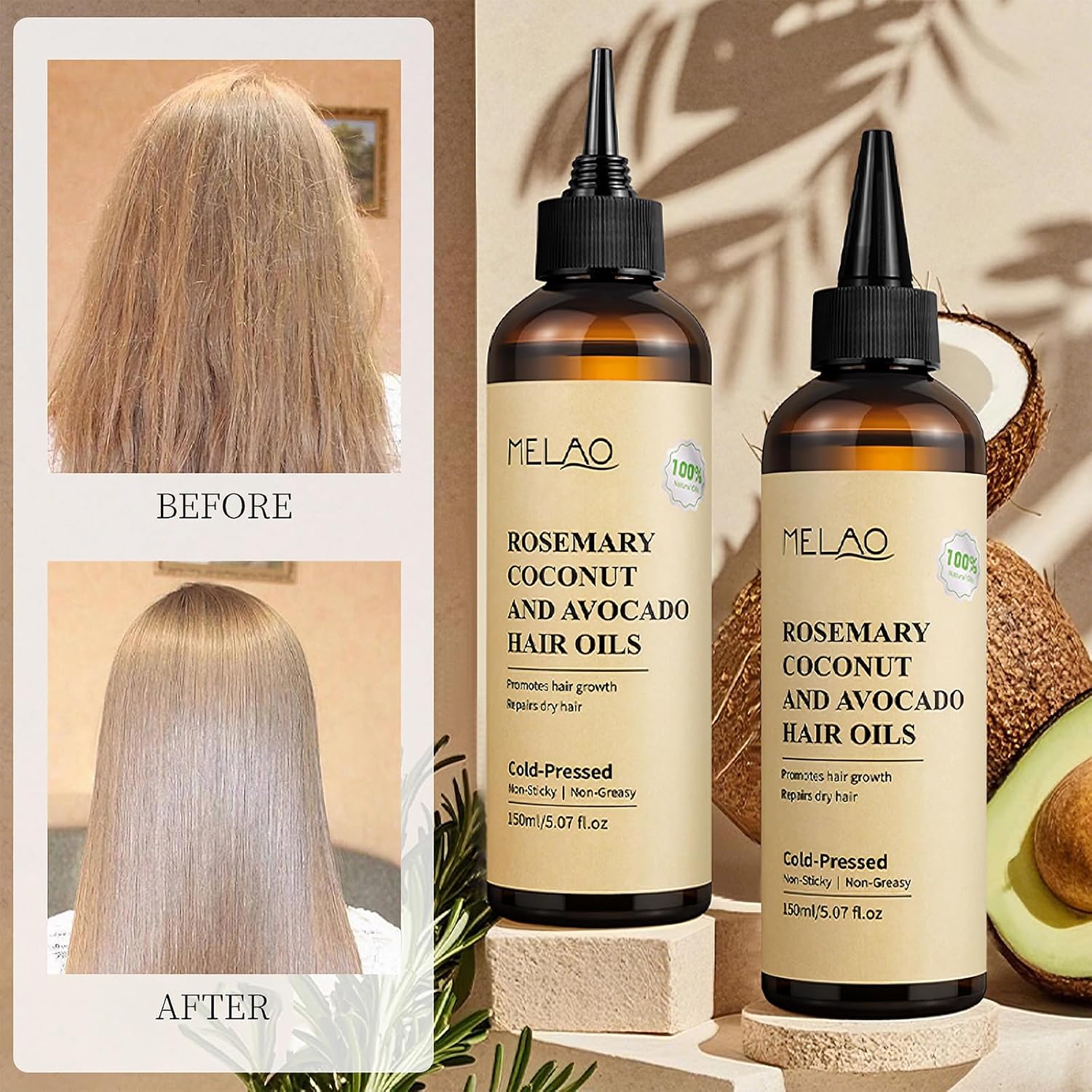 [Repairs Dry Hair & Split Ends] Coconut and avocado oils deeply nourish and repair dry, brittle hair, restoring softness, shine, and elasticity, making your hair healthier and more manageable.