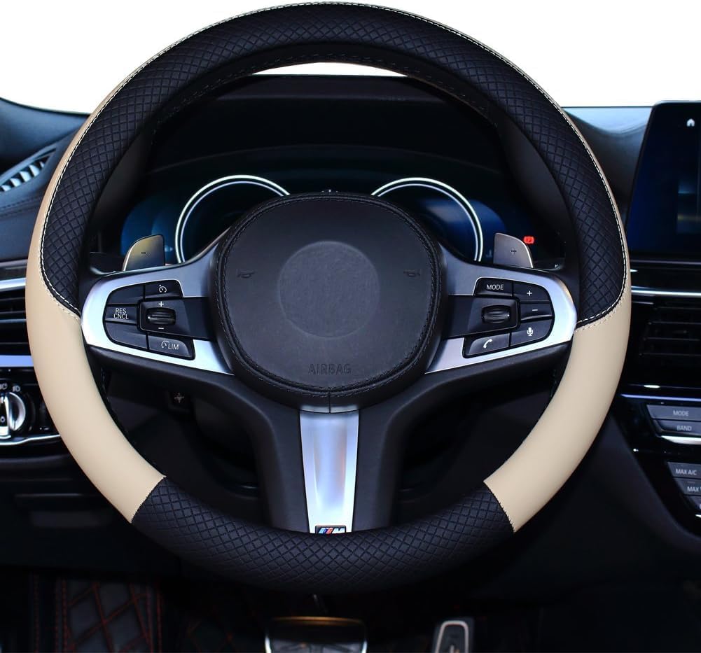 YLmeet Car Steering Wheel Cover, Genuine Leather, 15-inch Universal, Non-Slip and Anti-Odor,Steering Wheel Leather Protective Cover, Automotive Products, Four Seasons General Purpose (Beige)